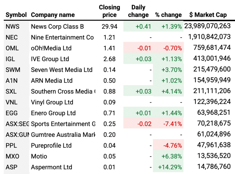 Amongst the broadcasters, Southern Cross Austereo was up by 4.1%, ARN Media was up by 1%, Seven West Media was up by 3.7% and Nine was flat.