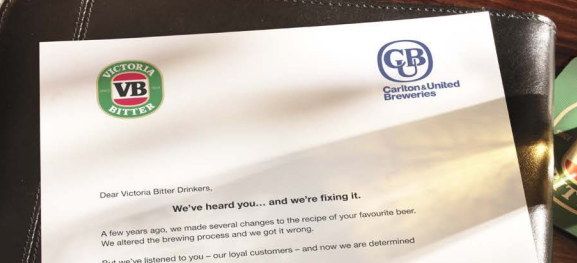 The ads take the form of an apology letter from the CEO of CUB, Ari Mervis, which begins: “A few years ago, we made several changes to the recipe of your favourite beer. We altered the brewing process and we got it wrong.”