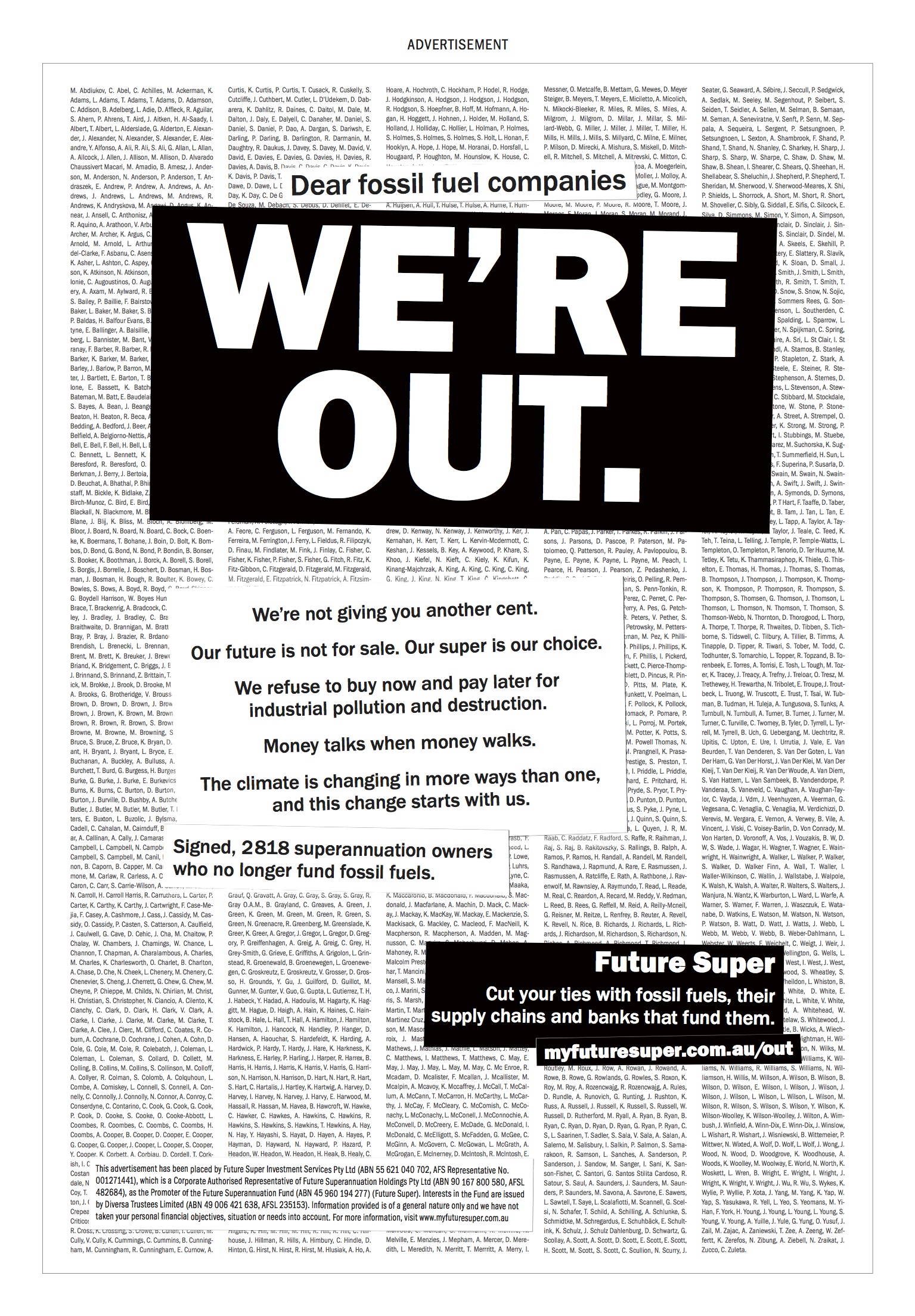 The ad appears like an open letter to fossil fuel companies from 2,818 Future Super customers, proclaiming ‘We’re Out’ and ‘We refuse to buy now and pay later for industrial pollution and destruction’.