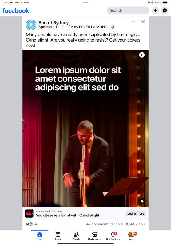 For the last few hours, a paid campaign has been running on Facebook featuring classic lorem ipsum placeholder text on top of the video ad. And the public approves.