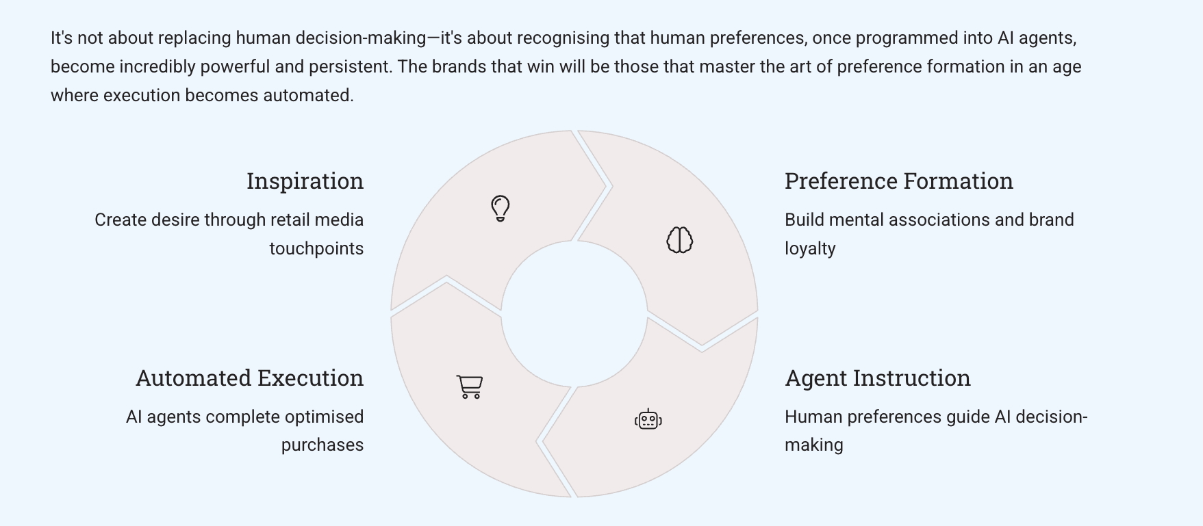 It’s not about replacing human decision-making, it’s about recognising that human preferences, once programmed into AI agents, become incredibly powerful and persistent. The brands that win will be those that master the art of preference formation in an age where execution becomes automated.