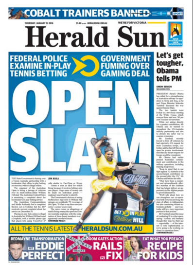 According to the article, the Victorian government is “fuming” over Tennis Australia’s partnership with William Hill that that offers in-play betting on matches, which is illegal online.