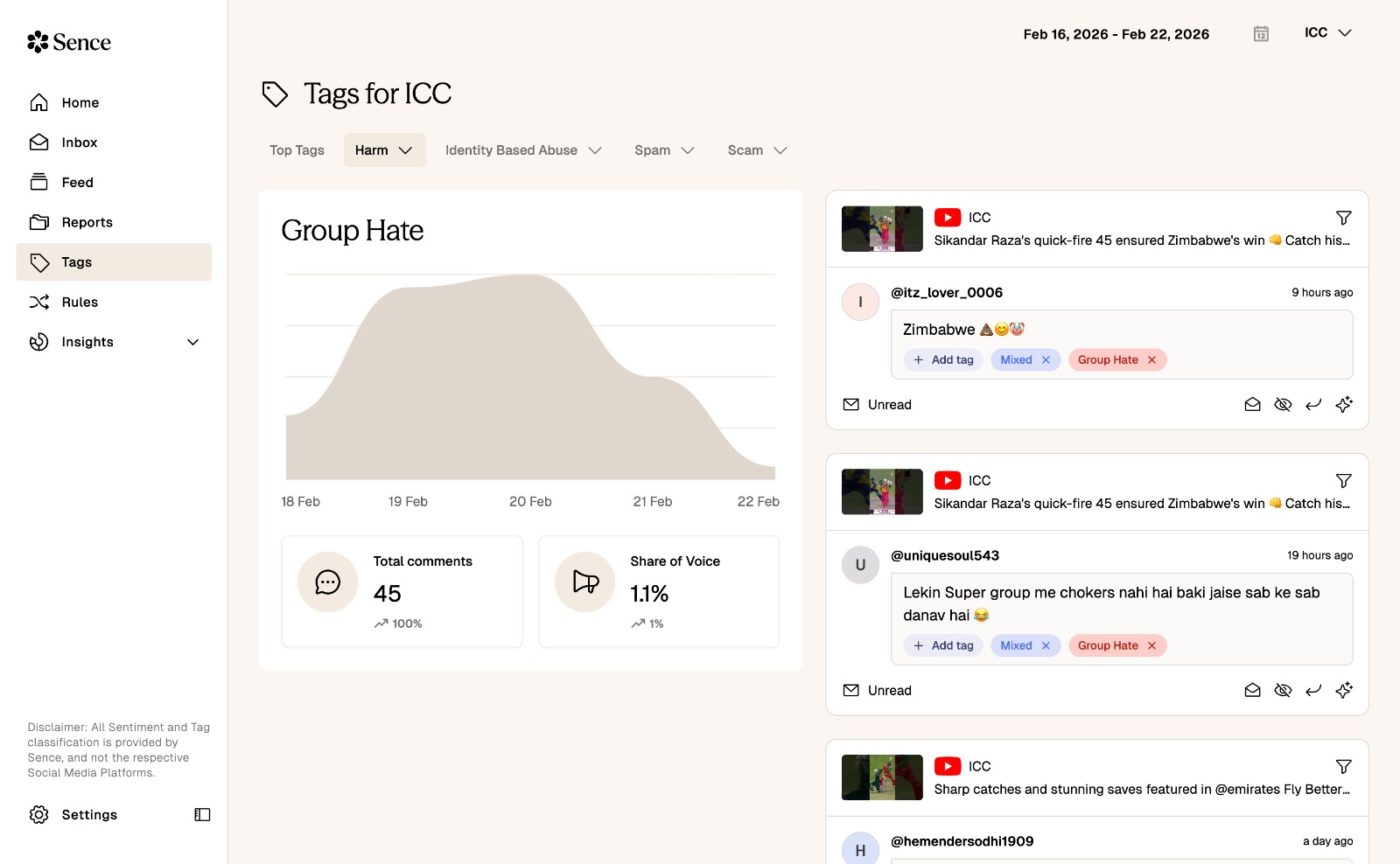 The Sence interface, in this case looking at Youtube comments on the ICC account (Sence)