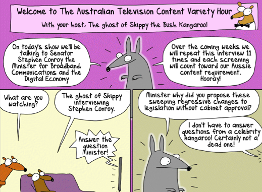 The cartoon is drawn by Crikey’s First Dog on the Moon and sees Skippy grilling Conroy over the amount of American television on Australian screens and what the production sector calls Conroy’s ‘sweeping regressive changes to local content sub-quotas’ to the TV network’s multi-channels.